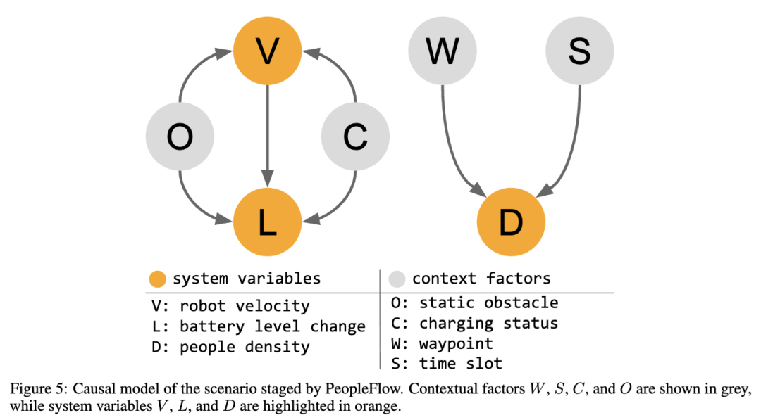 因果推理 给定从模拟器中提取的机器人和工人特征,以及在第4.2.1节中解释的上下文因素,影响机器人任务完成的关键因素是机器人电池消耗 L 和特定区域的环境人员密度 D。鉴于它们与其他变量和/或上下文因素的依赖性,机器人可以根据其速度 V 和充电状态 C 推理 L,而 D 可以通过特定时间段 S 和路径点 W 来估计。这些推理是在假设机器人知道自己的速度和充电状态的情况下进行的。此外,在与工人共享的仓库中,我们假设机器人知道当前时间,这使得它能够确定 S,以及环境中预定义的路径点。