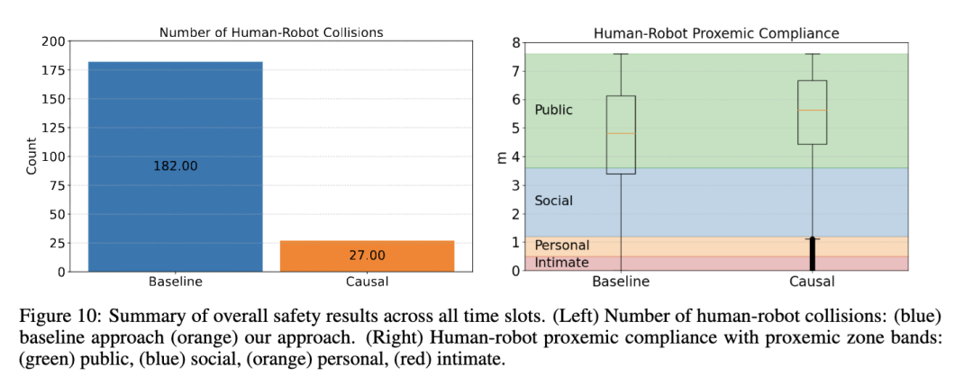 安全性分析第5.3节定义了用于评估人机空间交互(HRSI)安全性的指标,如图10所示,包括左侧的碰撞次数和右侧的人机空间距离合规性。碰撞次数用于量化机器人与人类之间处于接触距离内的实例数量,该距离设定为TIAGo机器人的基本半径7。图表对比了基线方法(蓝色)和因果方法(橙色)。图10右侧展示了所有时间段内人机距离分布的箱线图。背景颜色标示了不同的空间距离区域[68]:公共区(≤ 7.6米,绿色)、社交区(≤ 3.6米,蓝色)、个人区(≤ 1.2米,黄色)和亲密区(≤ 0.5米,红色)。