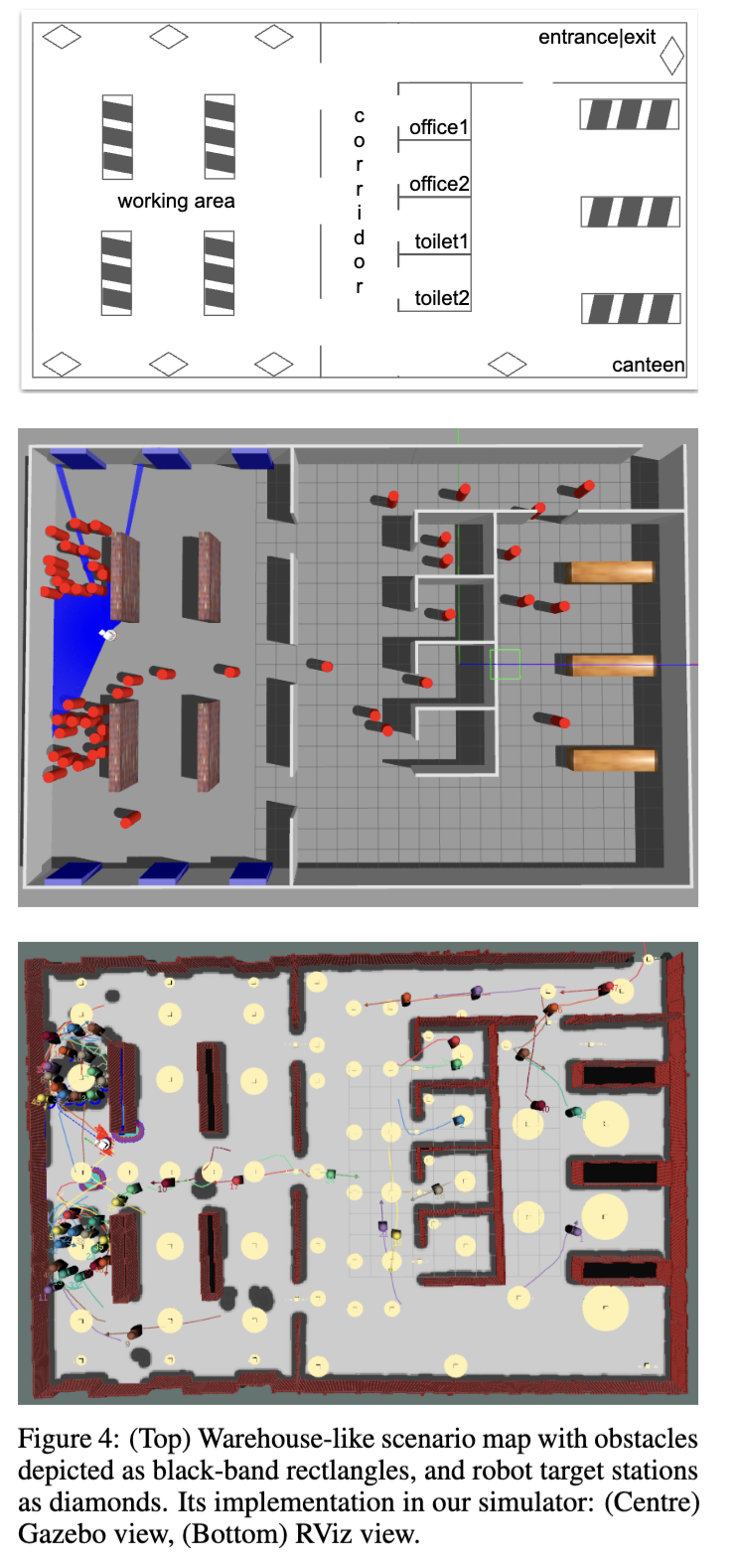 图4(上)展示了我们在模拟器中实现的仓库环境地图。该环境包含多个主要区域,包括入口、两个办公室、两个卫生间、一个食堂、一个工作区以及一条连接所有空间的走廊。黑色边框的矩形表示工作区中的货架(人类在此执行任务)和食堂中的桌子,而菱形则代表机器人的目标点(例如托盘和传送带)。在Gazebo中(图4,中间),人类被表示为红色圆柱体;而在RViz中(图4,底部),他们则以人形模型(manikins)的形式可视化。