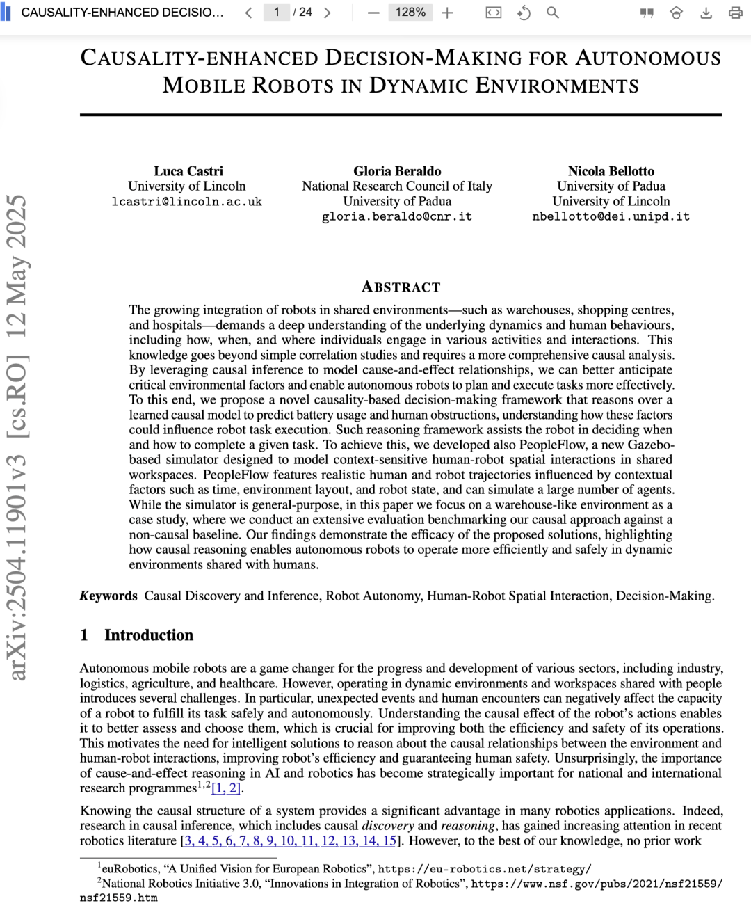 自主移动机器人是推动工业、物流、农业和医疗等多个领域进步与发展的重要变革力量。然而,在与人类共享的动态环境和工作空间中运行,带来了诸多挑战。特别是,突发事件和与人类的相遇可能对机器人安全、自主地完成任务的能力产生负面影响。理解机器人行为的因果效应,使其能够更好地评估并选择行动方案,这对于提升其操作效率和安全性至关重要。这促使我们需要智能解决方案,以推理环境与人机交互之间的因果关系,从而提高机器人的效率并保障人类安全。毫不奇怪的是,因果推理在人工智能和机器人领域的战略重要性已被多个国家和国际科研项目所重视¹²[1, 2]。