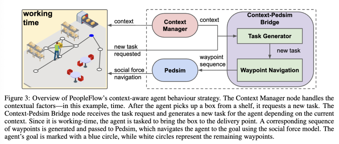 上下文管理器(Context Manager)节点负责管理特定场景的上下文因素(例如与时间相关的日常行为),并将当前上下文信息传递给上下文-Pedsim 桥接器(Context-Pedsim Bridge)节点。该桥接器节点负责为行人智能体生成新任务,并据此计算其导航路径。