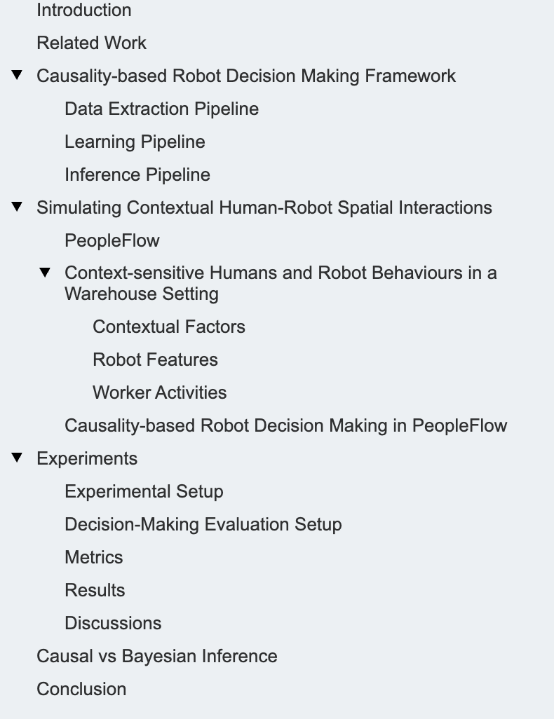 7 结论 在本研究中,我们提出了一种新颖的基于因果性的决策框架,以及一种新的人机空间交互(HRSI)模拟器。该模拟器包含一个移动机器人、多个行人智能体以及多种上下文因素。这些因素会影响人类与机器人的目标动态、他们之间的交互行为以及机器人的任务执行过程。我们的因果性框架集成了数据处理、因果发现和因果推理,使机器人能够做出更优的路径规划决策,并提前判断是否应继续执行或取消某项任务。这些决策基于两个通过因果推理得出的关键量:环境中特定区域的预期人员密度,以及到达目标位置所需的电池消耗估计值。所提出的系统在由PeopleFlow构建的模拟仓库场景中进行了应用与评估,该场景具有依赖上下文的目标和交互行为。实验结果验证了我们的方法在提升人机共存环境中的规划效率与安全性方面的有效性。