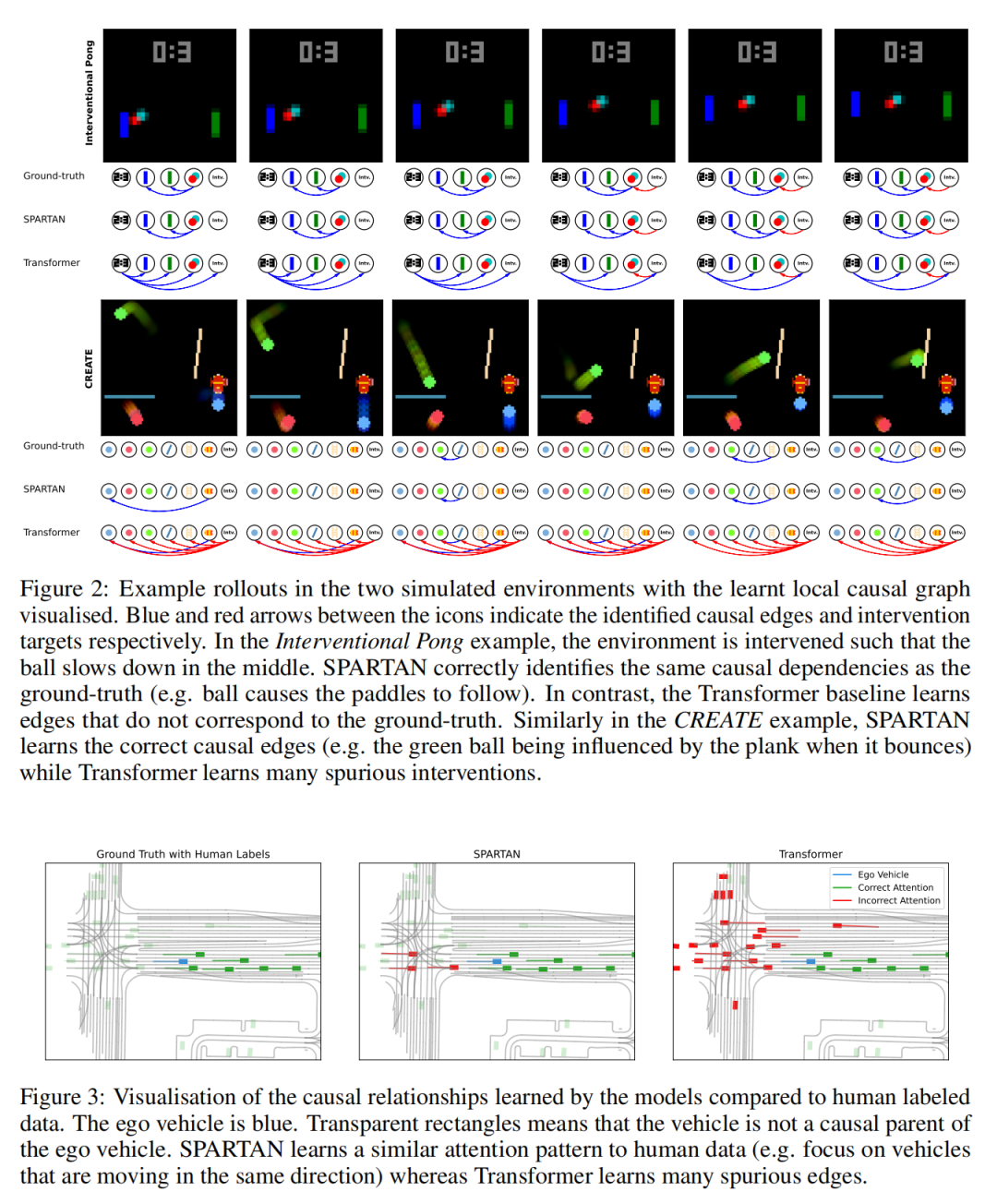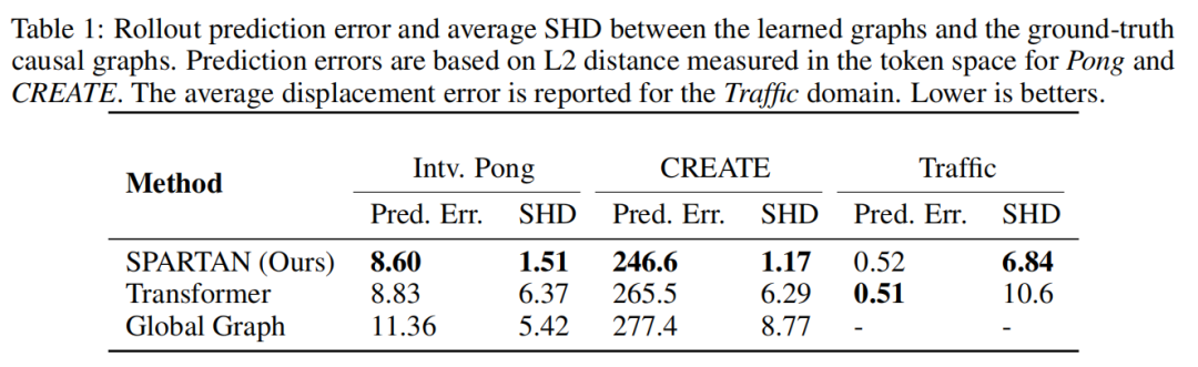 图2 展示了带有局部因果图的预测 rollout 示例。我们可以观察到,SPARTAN 能够在每个时间步可靠地恢复相关的因果边和干预目标。在 Interventional Pong 环境中,我们的方法识别出球拍始终受到球的影响,并随之移动。相比之下,Transformer 基线模型产生了错误的边,例如“得分(Score)→ 球(Ball)”(第1帧)。