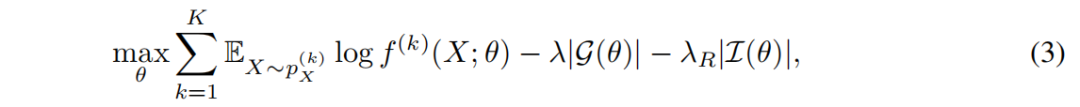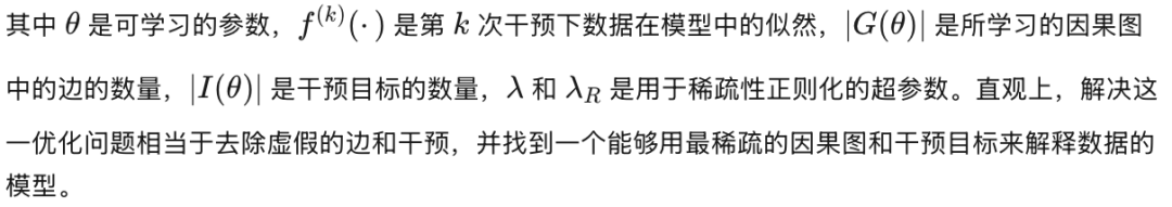 如第 2.2 节所述,我们的目标是在因果边和干预目标的数量上尽可能稀疏的前提下,拟合数据分布。训练的目标是最小化带有稀疏性正则化的期望模型损失,