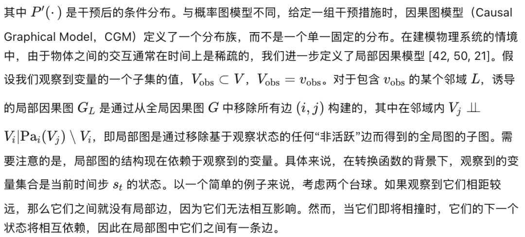 虽然在某些场景中学习一个全局因果图已经足够,但在动力学模型的背景下,全局图往往接近全连接,因为只要实体在任何时候发生过相互作用,它们就会在图中相连,无论这种交互的可能性有多低。回到交通的例子,一个全局因果图会将场景中的每一辆车都连接起来,因为当它们靠近时,所有车辆之间都可能发生影响。然而,像“车辆A导致车辆B停止”这样的事件,更适合用一个局部因果图来捕捉——图中包含边 A → B,但不包括此时与其他车辆无关的边。我们认为,一个包含大量局部无关边的全局图会阻碍模型充分利用当前问题的稀疏结构。