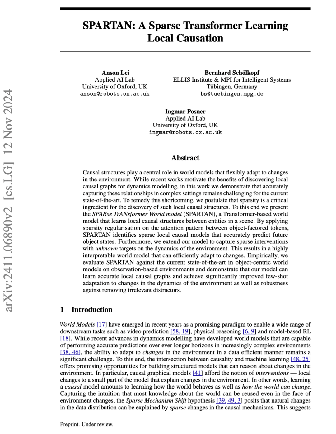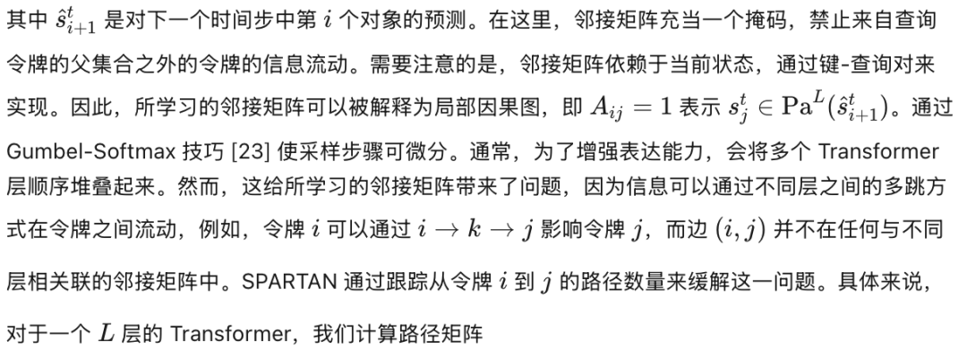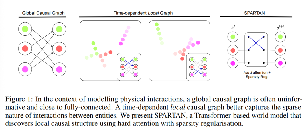 在本研究中,我们开发了一种可以应用于标准 Transformer 架构的稀疏正则化方案,使状态依赖和时间依赖的局部因果图得以发现。我们提出了 SPARTAN,这是一个基于 Transformer 的世界模型,其具有可学习的稀疏局部因果图结构。具体而言,SPARTAN 最小化 token 之间局部因果边的期望数量,从而能够发现对象之间准确且可解释的因果关系。我们在具有物理交互的观测环境和交通运动预测数据集 [52] 上评估了我们的模型,结果显示 SPARTAN 比以往方法更能准确识别因果边,从而在对非因果相关的对象进行干预时表现出显著增强的鲁棒性。我们进一步扩展模型以显式表示因果干预。通过这种方式,SPARTAN 能够以少样本方式高效适应环境变化。我们证明,由于所发现的因果结构,我们的模型在不牺牲整体预测准确性的前提下实现了更好的适应效率。