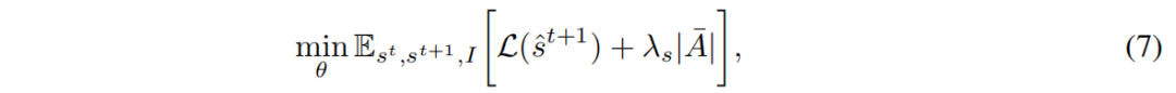 类似地,我们在学习局部因果模型的设置中应用了稀疏性正则化。如前所述,局部因果图和干预目标是由状态诱导出来的。在这里,我们的目标是在每一个时间步上推断出最稀疏的图,使得下一个观测可以被解释。为此,我们修改了用于局部因果发现的优化目标:与最小化一个固定全局因果图和干预目标的大小不同,我们提出最小化在数据分布下的期望边数和干预目标数量,其中因果边和干预目标在每个时间步动态构建。