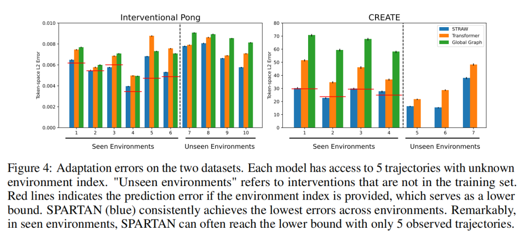 为了研究模型的适应效率,我们在来自干预环境的五条轨迹样本上对模型进行适配。对于 SPARTAN,我们按照第 3.2 节所述方式进行适配。对于全局图基线,我们也采用类似的优化干预标记的方式进行适配。而对于 Transformer 基线,则通过对给定轨迹进行梯度微调来进行适配。