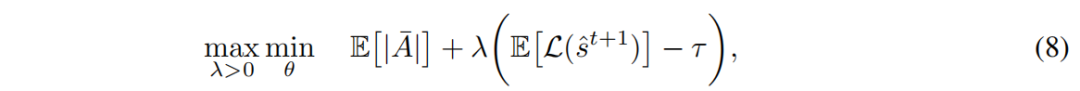 在实践中,模型对 λ 的选择非常敏感,因为过高的 λ 会导致模式崩溃(mode collapse),即模型中没有任何连接。由于移除非因果边不应降低预测准确性,我们将问题表述为一个约束优化问题 :在损失 L 不超过某个阈值 τ 的约束下,最小化 |Ā|,其中 τ 是目标损失。我们将目标损失设为全连接模型所能达到的损失值。通过拉格朗日松弛法(Lagrangian relaxation)[4],我们可以写出如下的极小极大目标函数: