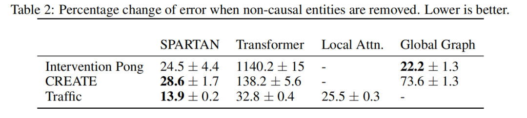 表2 显示,与未进行正则化的 Transformer 相比,SPARTAN 具有显著更高的鲁棒性,这表明 Transformer 过度拟合了实体之间的虚假相关性。在 Interventional Pong 领域中,真实因果图在各个时间步之间基本一致。因此,全局图基线足以捕捉因果结构,从而保持了鲁棒性。然而,在更复杂的 CREATE 领域中,由于局部因果图更依赖于状态,全局图基线的表现明显下降,而 SPARTAN 表现最佳。