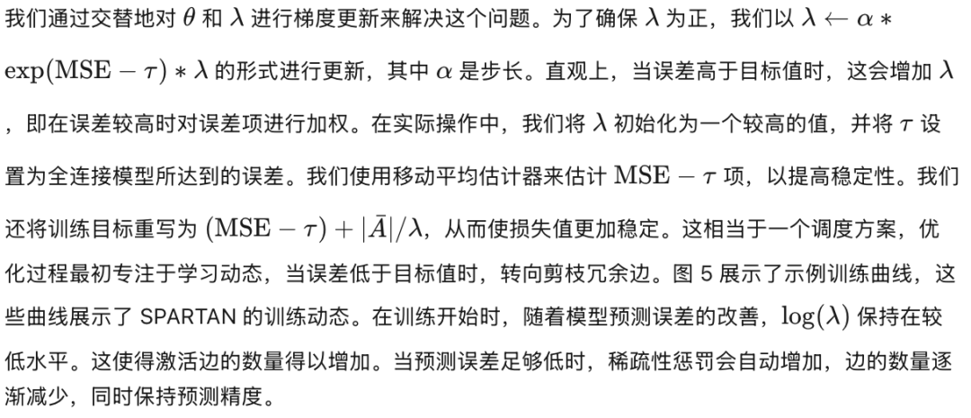 其中,λ 是拉格朗日乘子(Lagrangian multiplier)。我们通过交替对 θ 和 λ 进行梯度更新来求解该问题。 直观上,当误差高于目标值时,λ 会增加误差项的权重。通过将 λ 初始化为一个较大的值,这相当于设置了一个学习调度机制:当误差较高时,模型优先关注预测准确性;只有当误差下降到目标值以下时,才会逐渐剪枝(prune)连接。 有关该优化设置及其他训练细节的更多信息,请参见附录 A。