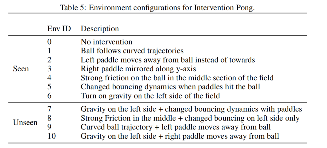 干预型乒乓环境 基于经典的 Pong 游戏,最初由 [36] 开发,用于研究因果表示学习。在原始工作中,干预方式包括对球和球拍的位置进行随机扰动。我们对其进行了修改,以模拟动力学变化,例如添加重力或改变球撞击球拍的方式,因为这些变化在世界模型学习的背景下更为合适。类似的设置也用于 [20] 中的小样本适应研究。