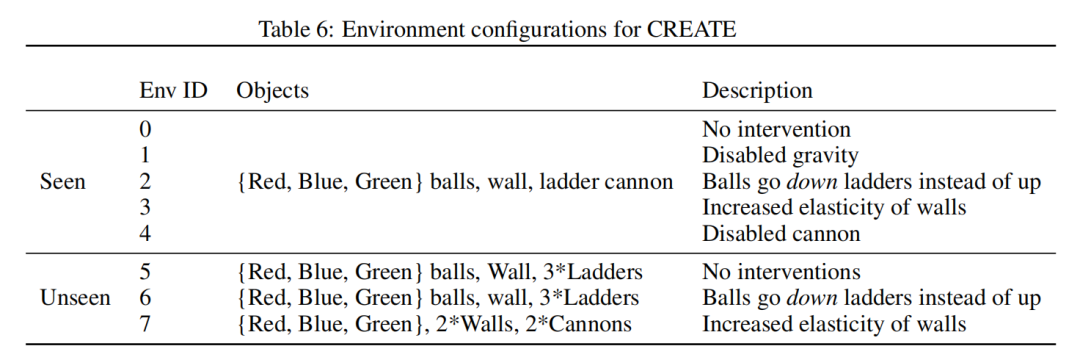 干预环境如表6所示。在未见过的环境中,我们通过改变场景组成(即对象数量)来测试模型的表现。