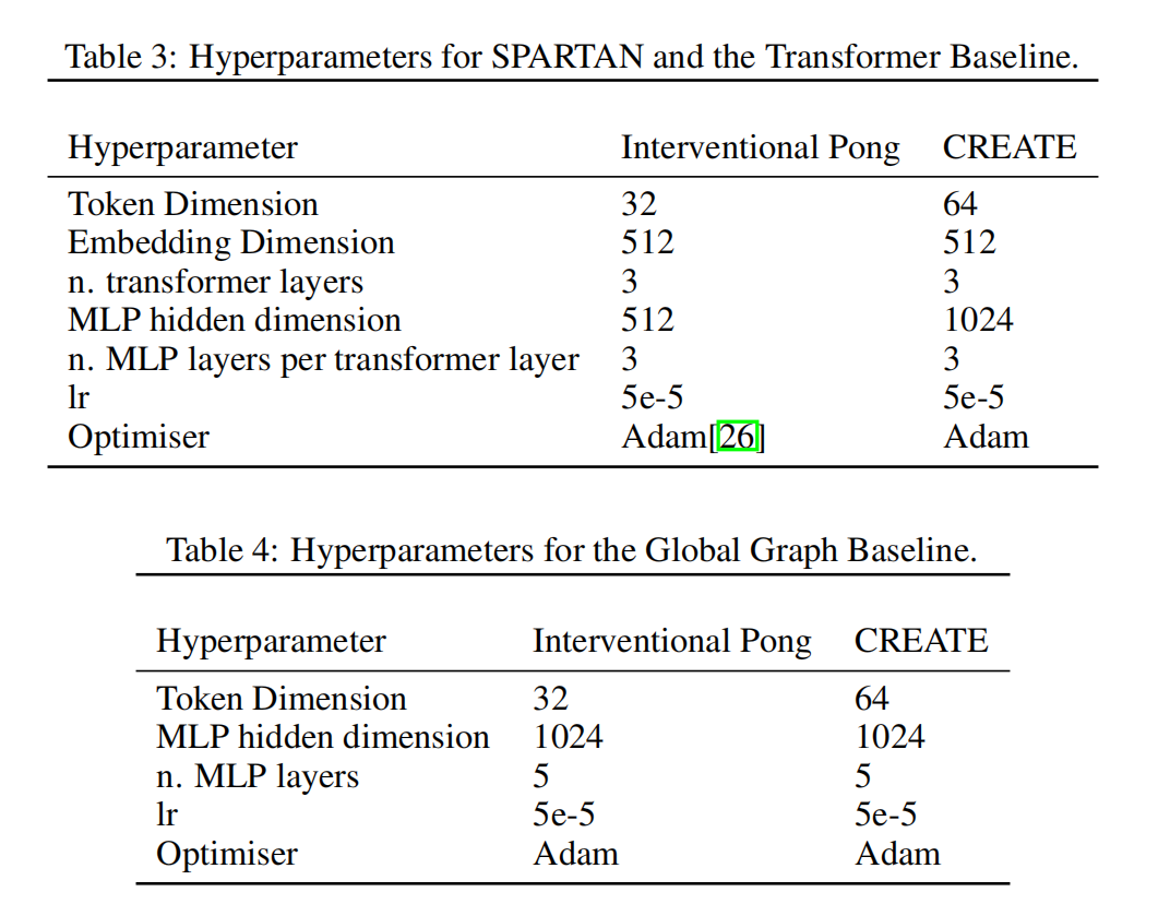 SPARTAN 和 Transformer 基线模型均实现为带有残差连接的堆叠式 Transformer 编码器层。全局图基线(Global Graph baseline)则实现为多层感知机(MLP)的集合,并带有可学习的邻接矩阵掩码。这与 [33, 20] 中的方法类似,不同之处在于我们的基线模型作用于对象嵌入(object embeddings),而非标量状态。每个 MLP 预测一个单独的对象嵌入。