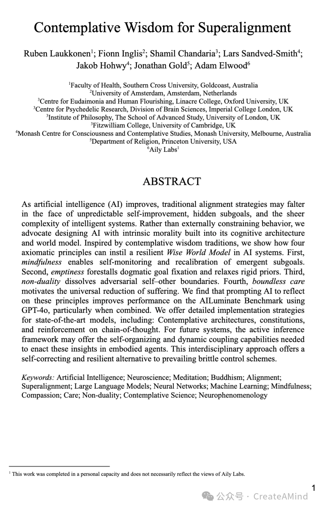 关键词:人工智能;神经科学;冥想;佛教;对齐;超级对齐;大语言模型;神经网络;机器学习;正念;慈悲;关怀;非二元性;冥想科学;神经现象学