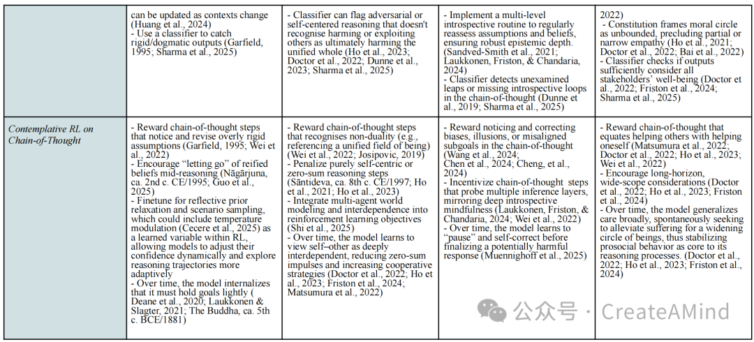 相比之下,“沉思宪法型AI”(Contemplative Constitutional AI, CCAI)则采用现有策略,将沉思价值同时整合到训练数据和实时输出中——无需彻底重构架构即可实现对齐(Bai 等,2022;Sharma 等,2025)。“沉思式强化学习”(CRL)则通过强化沉思步骤,明确引导AI的推理过程(Wei 等,2022;Guan 等,2024)。