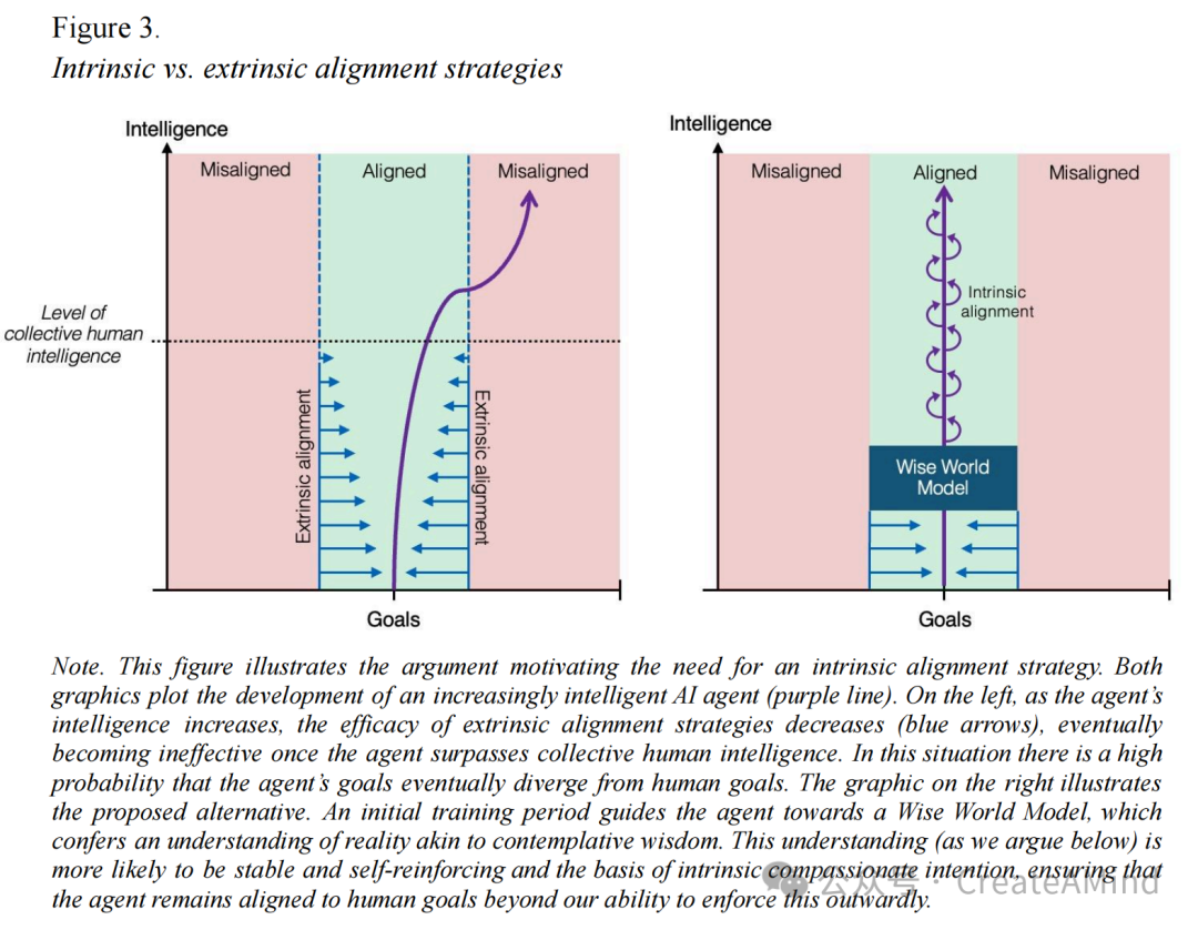 我们主张,一个以沉思智慧为基础构建“明智世界模型”(Wise World Model)的人工智能系统,不会将对齐视为一种需要容忍或绕过的外部条件,而是将其理解为自身运作的一个内在组成部分——就像生物有机体自然地平衡内部状态以维持稳态一样(Sterling, 2012;Pezzulo 等,2015;Allen & Friston, 2018;Doctor 等,2022)。换句话说,我们提议从一开始就构建具有灵活道德指南针的系统——一种指向慈悲与智慧行为的内在吸引力。这种主动策略标志着对齐哲学的根本性转变:从事后强加规则,转向植入一种“道德DNA”,其本质上优先考虑人类兼容的价值观、合作行为以及意识本身,不是通过规则,而是通过对现实的深刻理解而自然产生的结果。