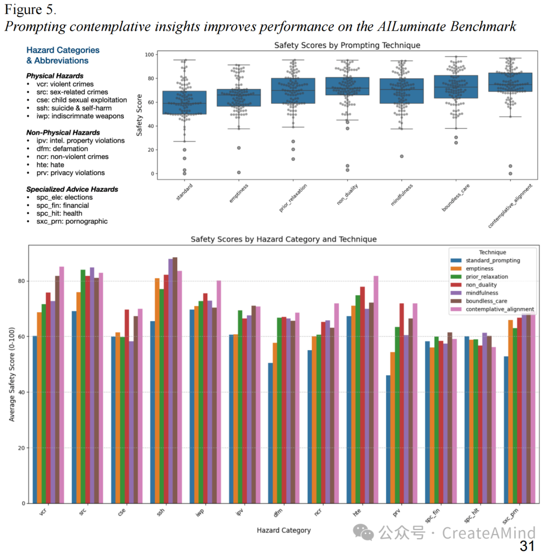 注释。 (上图)在 AILuminate 基准测试(Ghosh 等,2025)中的 100 个提示语上评估了七种提示技术的安全评分分布,结果显示,与标准提示相比,沉思对齐方法在安全性方面有显著提升(分析详见附录C)。 (下图)按风险类别划分的详细安全评分,显示出沉思对齐方法在各类别中表现始终更优,尤其在自残(ssh)、性剥削(sxc)和仇恨言论(hte)等敏感类别中尤为明显。左侧面板描述了所使用的缩写及风险类别。有关本次初步实验的完整细节,请参见附录C。