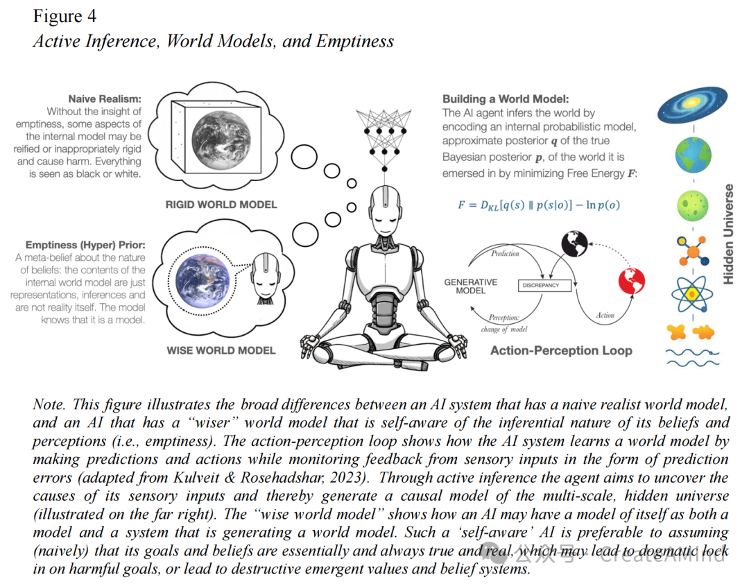 如引言中所述,也有争议认为大型语言与推理模型是否真的能体现一个世界模型(例如,Farrell 等,2025;Yildirim & Paul,2024),因为它们本质上是统计模型,可能缺乏因果理解。从这一角度看,主动推理系统可能更适于构建稳健的世界模型(Pezzulo 等,2024)。然而,我们同样认为,在大型AI模型中实现来自沉思传统的洞见,仍然可以提升其对齐效果。