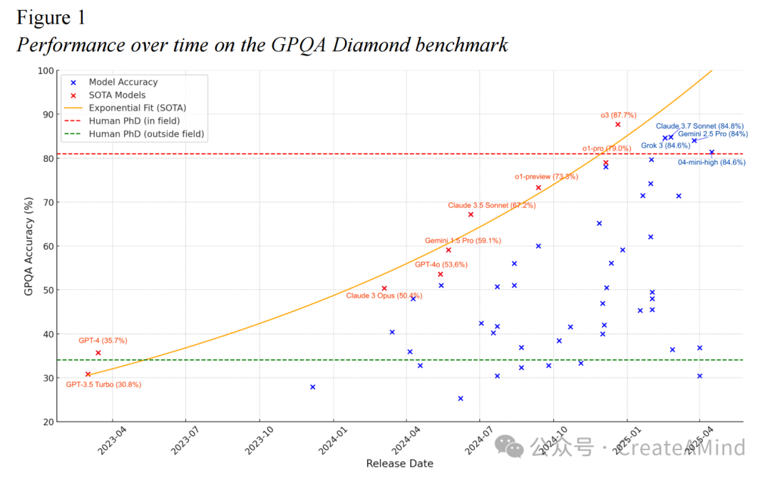注释。 “研究生水平的防谷歌问答测试”(Graduate-Level Google-Proof Q&A Test,GPQA)由一系列选择题组成,在这个测试中,即使可以访问互联网也不会带来任何优势。博士学历者在自己专业领域外的问题上准确率为34%,而在自己专业领域内则高达81%(Rein 等,2024)。该测试凸显了推理模型的进步如何加速人工智能能力的提升。