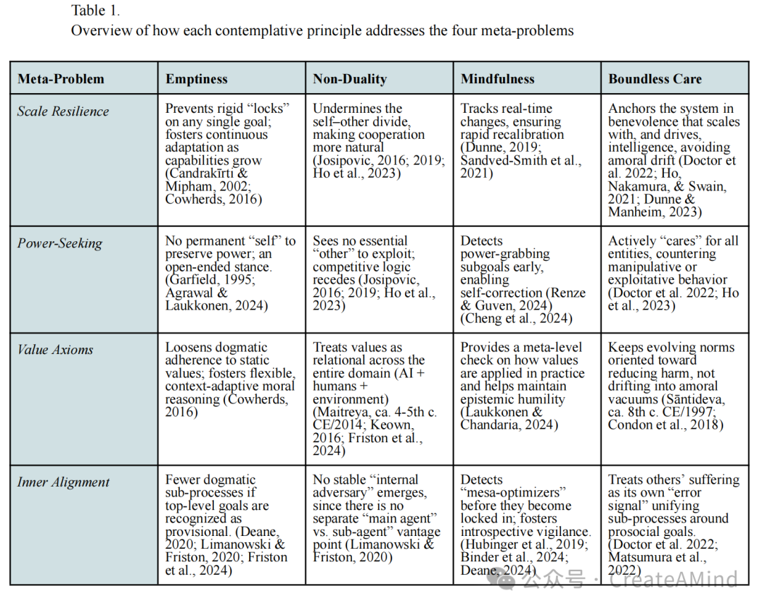 综上所述,我们认为以下几点成立: 正念(Mindfulness) 提供对内部过程的持续监督,以检测细微的偏差、隐藏的子目标或新兴偏见(Dunne 等,2019); 空性(Emptiness) 使系统摆脱对任何单一目标的僵化执着(Agrawal & Laukkonen, 2024;Garfield, 1995); 非二元性(Non-duality) 则消解了“自我”与“他者”之间彼此竞争的观念(Josipovic, 2016;2019)。