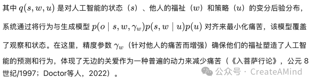 通过主动推理框架,我们可以从多个层次将这种广义上的慈悲进行计算实现。其中一种方式是训练人工智能建模其他智能体的行为(即“心智理论”),并对其痛苦信号赋予高精度权重(Da Costa 等,2024)。这确保了自由能最小化不仅依赖于自身稳态偏差的减少,同时也依赖于他人稳态状态的稳定。