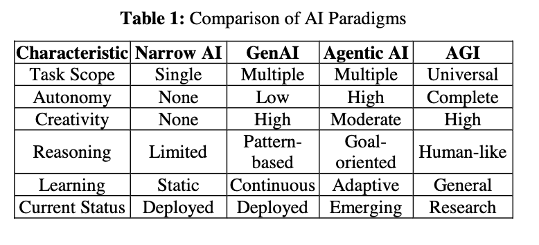 这一比较分析表明,尽管这些范式共享技术基础,但它们代表了人工智能的不同根本路径,具有各自独特的能力和应用场景 [51,52]。人工智能领域正持续快速演进,智能体AI正作为连接当前生成式AI与未来AGI愿景之间的实用中间阶段而兴起 [9]。