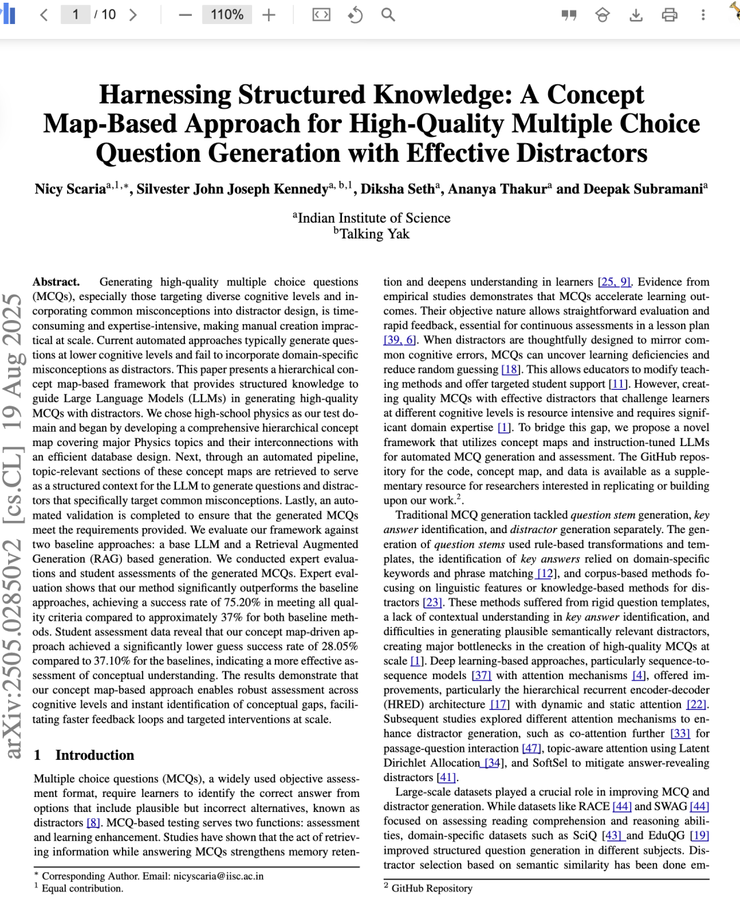 这种综合评估方法结合了通过结构化标准进行的专家评估,以及基于学生表现指标的学习者中心评估,从而对我们的概念图驱动方法生成的多项选择题(MCQs)以及两种基线方法生成的题目进行了严格、全面的评估。
