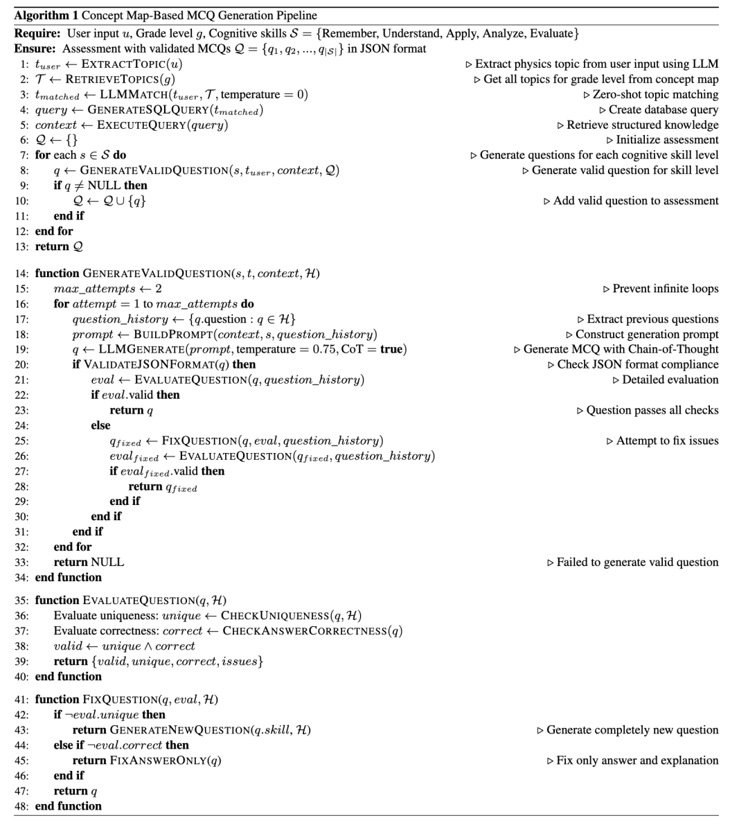 图1(2)展示了我们基于概念图的多项选择题(MCQ)生成的端到端流程,该流程包含三个主要组件:(a) 使用结构化内容进行提示,(b) 多项选择题生成,以及 (c) 验证。该流程也在算法1中以算法形式进行了详细说明。