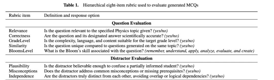 由四位具有研究生学历且在物理学科领域具备专业知识的专家组成评审小组进行评估。每道题目由四位专家中的两位独立评审,使用一个包含八项指标的评分量规(见表1),用于评估题目的质量和干扰项的有效性。