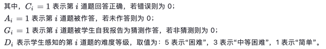 在整个学生群体中,共使用了九个不同版本的测试试卷,每位学生仅完成其中一个版本。这种方法使我们能够在保持单个学生测试长度合理的同时,覆盖更广泛的生成题目。对于每一道回答的题目,我们收集了学生的答案、答题时间、自我报告的猜测情况以及对题目难度的主观感知。学生通过选择“是”或“否”来直接表明自己是否进行了猜测。同时,他们还需将每道题的感知难度评为“困难”、“中等困难”或“简单”。