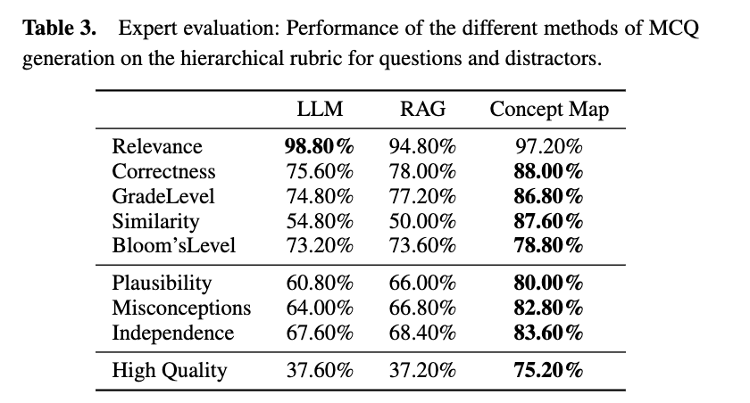 表3展示了不同多项选择题生成方法(基础LLM、RAG和基于概念图的方法)的性能表现。“高质量”行表示在所有评估标准上均获得两位专家一致正面评价的题目所占百分比。结果以符合各项标准的题目百分比表示,基于两位专家达成一致的判断。