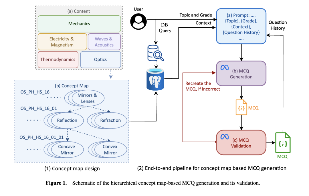 图1展示了我们为自动化生成和验证多项选择题(MCQs)所开发的整体系统的示意图。系统的关键组成部分包括:概念图、基于大语言模型(LLM)从概念图生成问题,以及自动化验证。