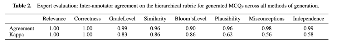 表2展示了两位专家评审员在各项评估标准上的评分者间一致性(inter-annotator agreement)。专家判断具有高度可靠性:在“相关性”和“正确性”两项上达到了完全一致(1.00),其余各项的一致性也较高(0.90–0.99)。科恩·卡帕(Cohen’s Kappa)值显示,与题目相关的标准(相关性、正确性、年级水平、相似性以及布鲁姆层次)具有很强的一致性(κ > 0.80),而与干扰项相关的标准(合理性、误解、独立性)则表现出中等至一般的一致性,这可能是因为评估干扰项的合理性以及识别误解本身具有较强的主观性。