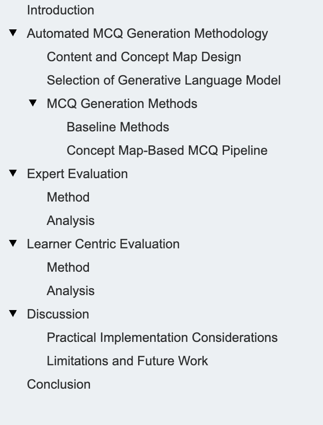 在接下来的部分中,我们将详细介绍我们的自动化多项选择题生成方法(第2节),随后是专家评估(第3节)和以学习者为中心的评估(第4节),每一部分均涵盖相应的方法与分析。接着我们讨论关键发现、实际实施中的考虑因素以及未来研究方向(第5节),最后总结本研究的更广泛意义(第6节)。