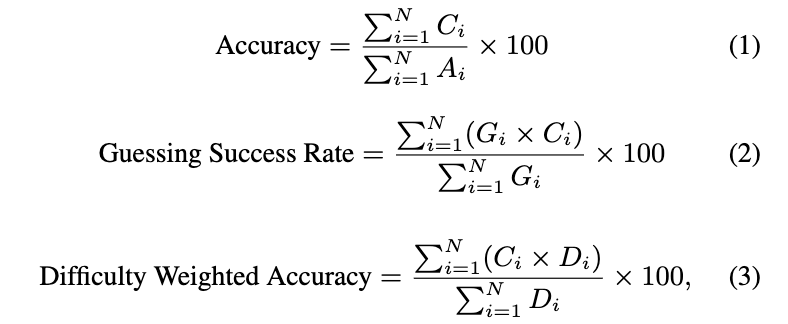 “猜测成功率”是使用的主要指标,“准确率”和“难度加权准确率”作为附加指标,以全面评估题目的质量。这些指标定义如下。