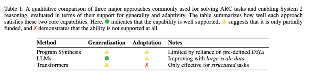 近期解决 ARC 任务的努力采用了多种范式,包括程序合成、大语言模型(LLMs)以及专用的 Transformer 架构。从系统2推理的角度来看,这些方法虽在泛化能力上有所提升,但在适应性方面仍面临困难,尤其是在面对不熟悉的规则或示例极其稀疏的情况下。表1对这些方法进行了比较性总结,从通用性、适应性和系统2能力三个维度评估了它们的优势与不足。这一分析凸显了对新方法的迫切需求——这些新方法需更好地融合泛化与适应能力,以推动 ARC 中的推理进展。