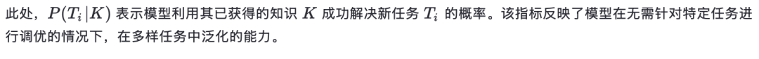通用性使人工智能模型能够将已有知识应用于新情境。与在训练数据上过拟合不同,一个具备通用性的AI系统能够抽象出底层原理,并将其迁移到不同任务或领域中。例如,一个在物体识别任务上训练的模型,应能以极少的监督将其理解扩展到新类别。 AI模型 M在任务集合 T和领域知识 K上的通用性可形式化为: