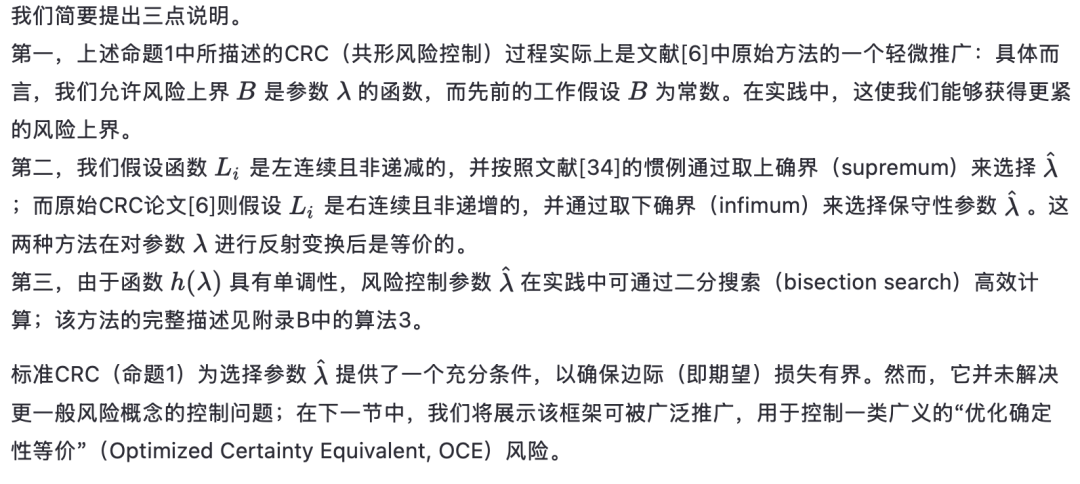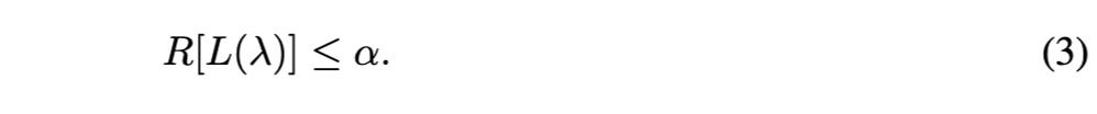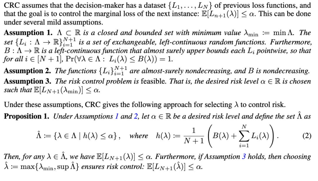 文献中已提出了多种用于控制预训练机器学习模型风险的后处理方法。其中最著名的是共形风险控制(CRC)[6] 方法,它提供了一种无需分布假设、适用于有限样本的方法,可严格实施风险上界(1)。在本节余下部分,我们将省略模型参数 θ 作为损失函数 L 的输入,因为相关结果不仅适用于控制机器学习模型决策风险的情形。