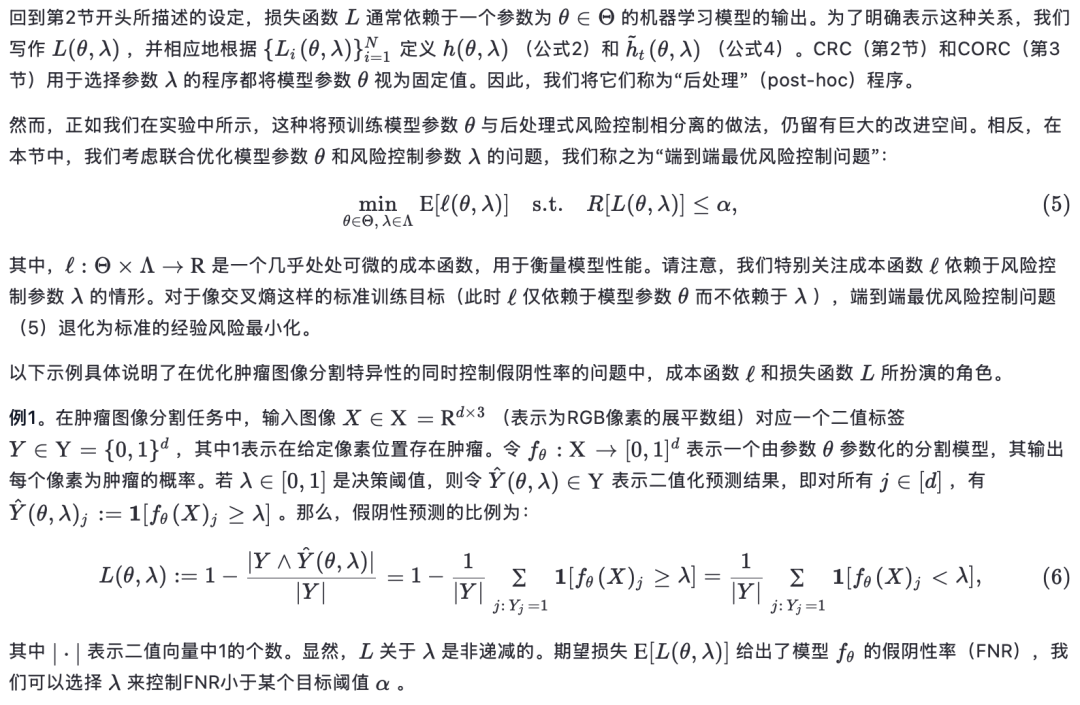 例如,在肿瘤图像分割问题中,L 可能表示从随机抽取的图像中假阴性像素所占的比例,而 α 是期望的假阴性率(FNR)的上界。激进程度参数 λ ∈ [0, 1] 可被选作区分阳性预测与阴性预测的阈值。因此,较小的 λ 将产生更多的阳性预测和更低的假阴性率,而较大的 λ 将产生更多的阴性预测和更高的假阴性率。有关此任务的更详细描述,请参见例1。
