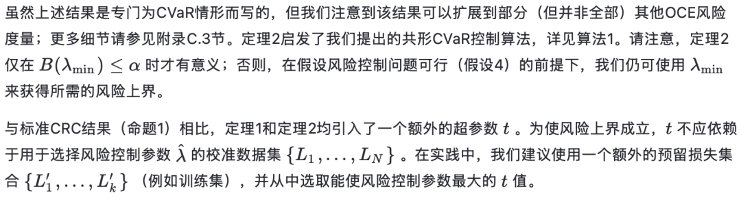 共形风险控制(CRC)方法 [6] 为解决风险控制问题提供了一个充分条件,前提是损失函数 L 是单调的。尽管CRC简洁而优雅,但其原始形式存在若干局限性。首先,CRC仅能控制损失 L 的期望值,而现实世界高风险问题往往需要更通用的风险概念。值得注意的是,原始CRC论文 [6] 明确提出了一个开放问题:如何将方法扩展到期望损失之外的更一般风险度量,例如条件风险价值(CVaR)。其次,由于CRC纯粹作为后处理步骤(即仅作用于预训练模型的输出,而不向模型提供任何反馈),可能会显著降低模型性能。