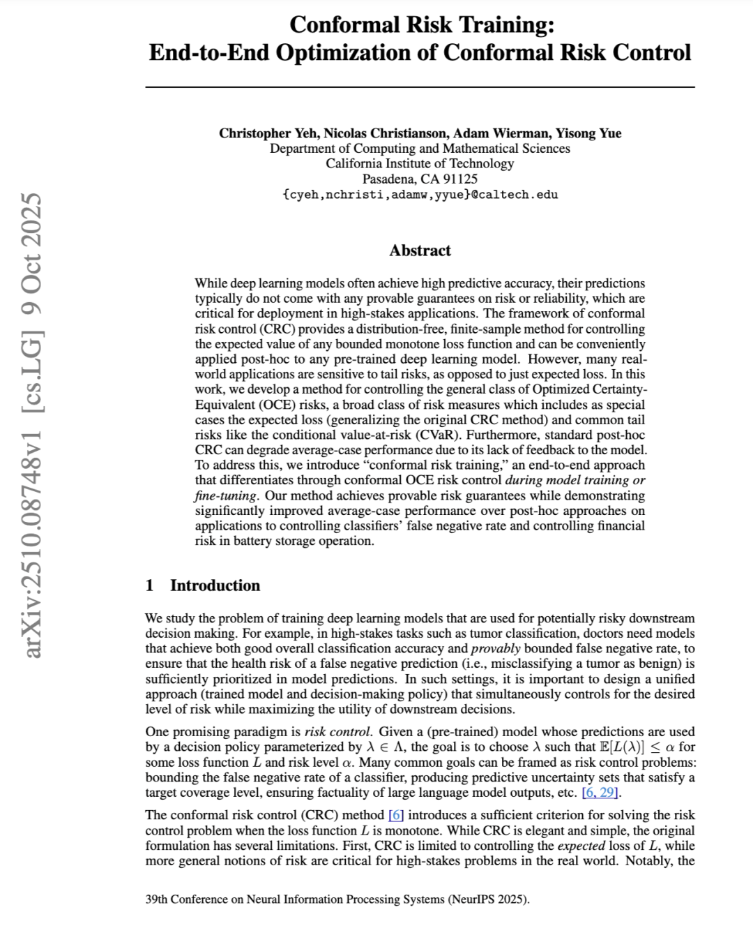 尽管深度学习模型通常能达到很高的预测准确率,但其预测结果通常缺乏关于风险或可靠性的可证明保证,而这种保证对于高风险应用场景中的部署至关重要。共形风险控制(Conformal Risk Control, CRC)框架提供了一种无需分布假设、适用于有限样本的方法,用于控制任意有界单调损失函数的期望值,并可方便地作为后处理步骤应用于任何预训练的深度学习模型。然而,许多现实世界的应用对尾部风险(tail risks)非常敏感,而不仅仅是期望损失。在本文中,我们提出了一种方法,用于控制一类广义的“优化确定性等价”(Optimized Certainty Equivalent, OCE)风险——这是一类广泛的风险度量,其特例包括期望损失(从而推广了原始的CRC方法)以及常见的尾部风险,如条件风险价值(Conditional Value-at-Risk, CVaR)。此外,标准的后处理式CRC由于在模型训练中缺乏反馈机制,可能会损害模型在平均情况下的性能。为解决这一问题,我们提出了“共形风险训练”(conformal risk training)——一种端到端的方法,在模型训练或微调过程中对共形OCE风险控制进行可微分优化。我们的方法在提供可证明风险保证的同时,在控制分类器假阴性率和电池储能运行中的金融风险等任务上,显著优于后处理方法的平均性能。