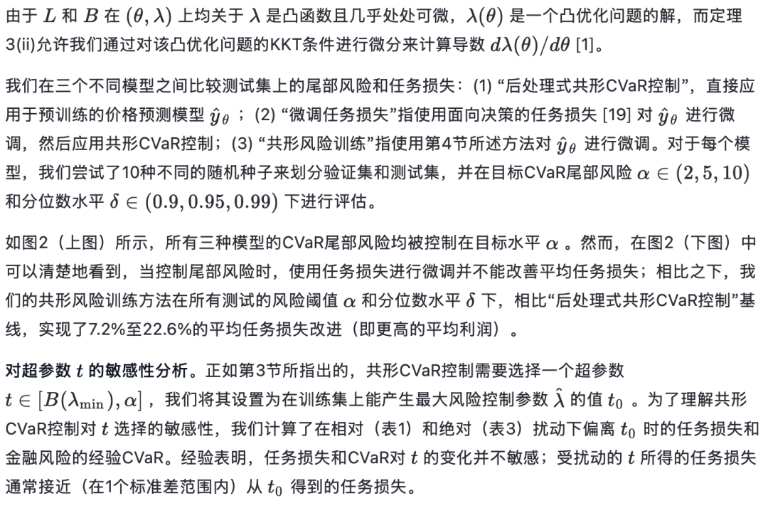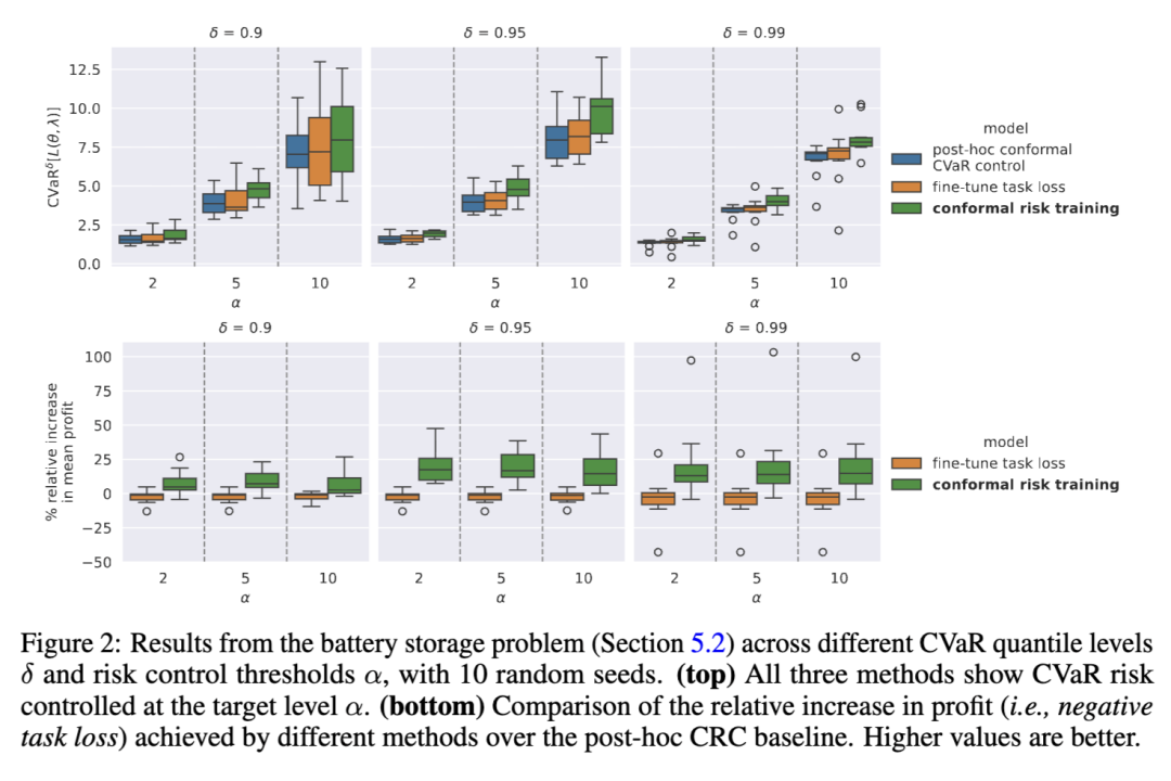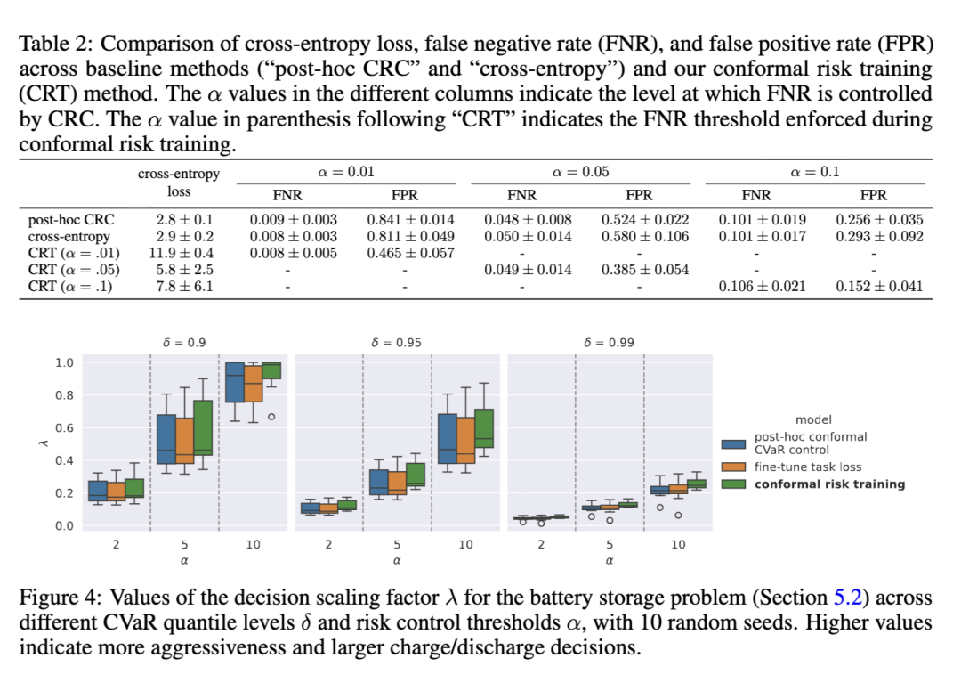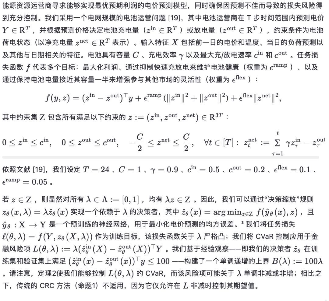 5 实验 在本节中,我们在两个问题上展示了共形风险训练方法的实验结果:(1) 肿瘤图像分割中的假阴性率(FNR)控制 [6];(2) 电网级电池储能运行中损失的条件风险价值(CVaR)控制 [19]。用于复现实验结果的代码已在 GitHub 上公开²,更多实验结果与细节见附录 A 和 D。