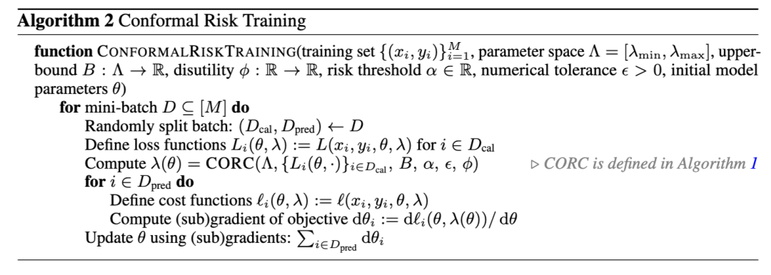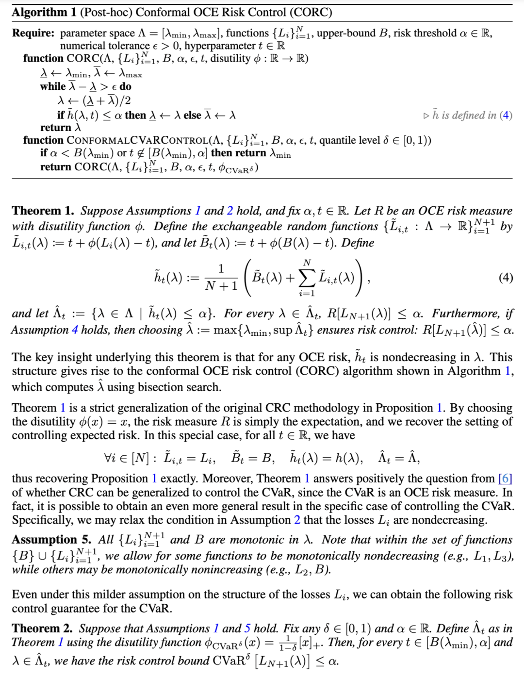 论文结构。本文结构如下:第2节介绍整体问题设定并回顾标准CRC结果;第3节提出我们对OCE风险共形控制的广义框架(标准CRC为其特例),并展示该框架在CVaR风险情形下可进一步放宽假设;第4节介绍共形风险训练过程,并讨论如何计算风险控制参数的梯度;第5节展示关键实验结果;第6节总结全文。附录A提供额外实验结果,所有证明见附录C。