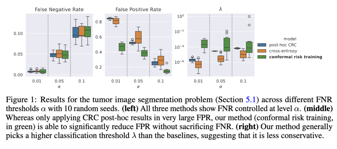 如图1所示,所有三种模型的期望 FNR 均被有效控制在目标水平 α。然而,对于“后处理式 CRC”和“交叉熵”这两种基线方法,应用后处理 CRC 会显著增加 FPR——当目标 FNR 为 1% 时,FPR 甚至高达 80%。相比之下,我们的共形风险训练方法在不同 α 水平下平均将 FPR 降低了 23% 至 42%。此外,我们的方法得到的 λ 平均值明显大于基线方法,表明该方法在维持风险保证的同时,降低了决策的保守性。
