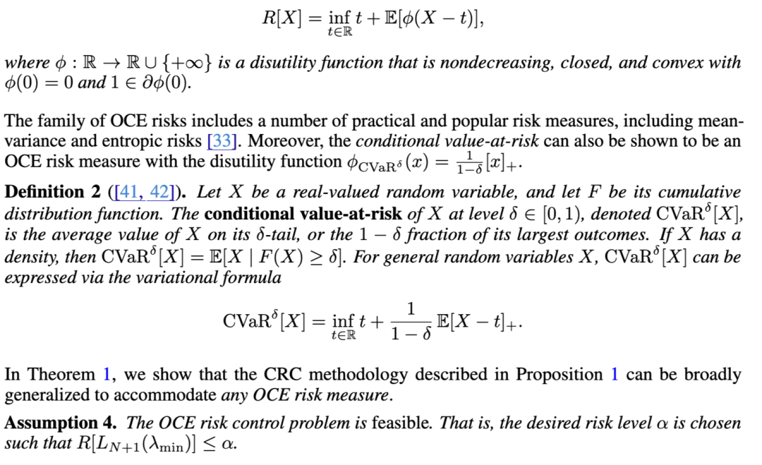 在本节中,我们对此问题给出了肯定的回答,并证明事实上,CRC 可以被推广至控制一大类被称为“优化确定性等价”(Optimized Certainty Equivalent, OCE)的风险度量,其定义如下:
