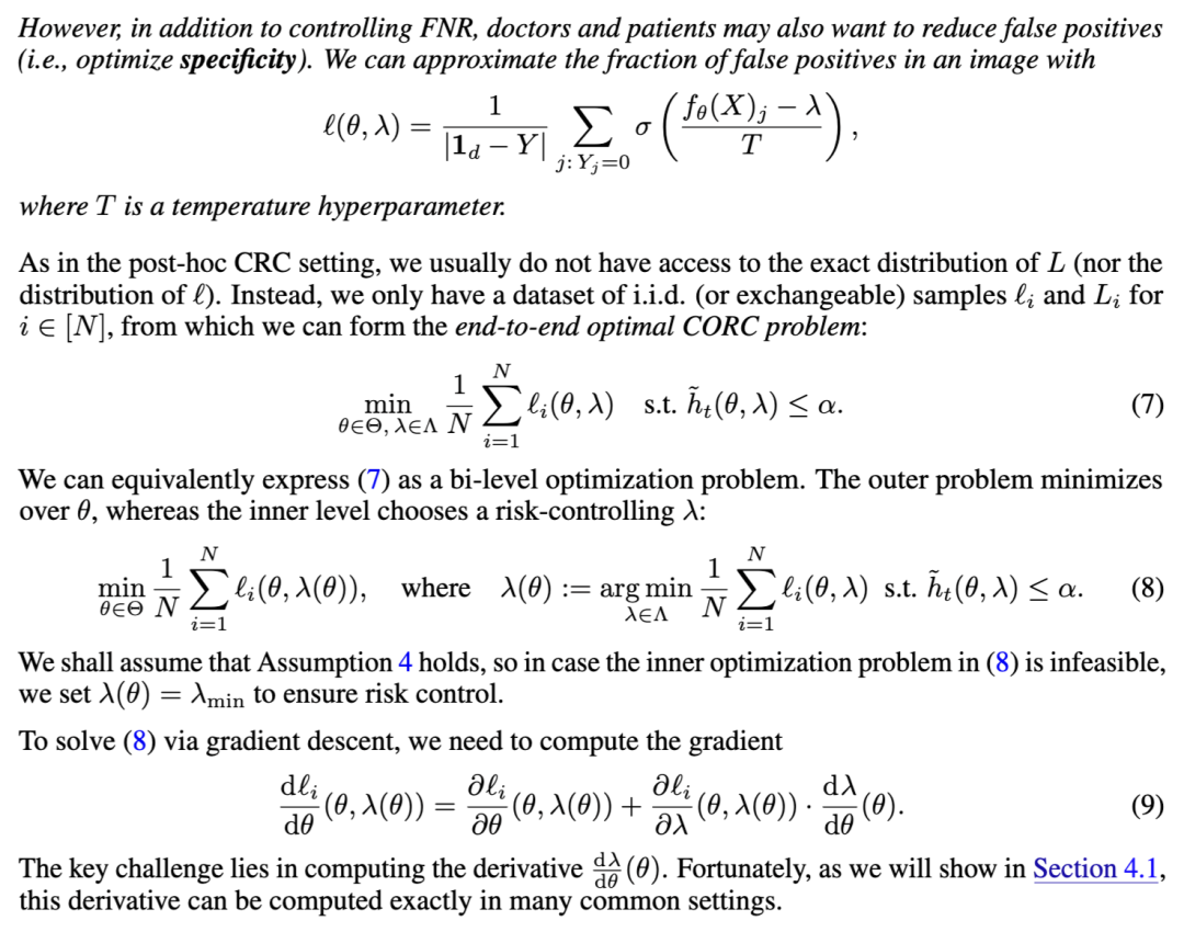 尽管我们在本节提出的共形OCE和CVaR风险控制方法能够控制比原始CRC框架广泛得多的风险类型,但这种后处理式风险控制程序在机器学习模型部署时仍可能带来显著的性能代价。例如,将CRC应用于控制肿瘤分割模型的假阴性率,可能会导致假阳性率大幅上升(参见我们实验中的图1)。由于CRC被设计为仅作为后处理步骤应用于预训练模型,目前尚无方法可以缓解由此带来的性能下降。为了在保证风险可控的同时提升模型性能,更优的策略是在训练或微调模型时直接施加一个强制实现风险控制的约束。设计实现这一目标的方法论,正是下一节的重点。
