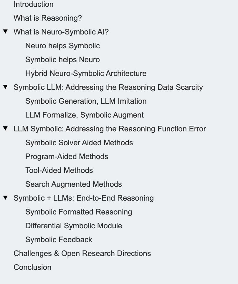 鉴于该领域发展迅速且相关文献数量庞大,本文无法全面涵盖所有研究成果。因此,我们聚焦于呈现核心思想与关键技术路径。本文旨在为近期进展提供一份及时的综述,并激发关于如何将符号人工智能方法与 LLM 有效融合以构建强大推理模型的新见解。