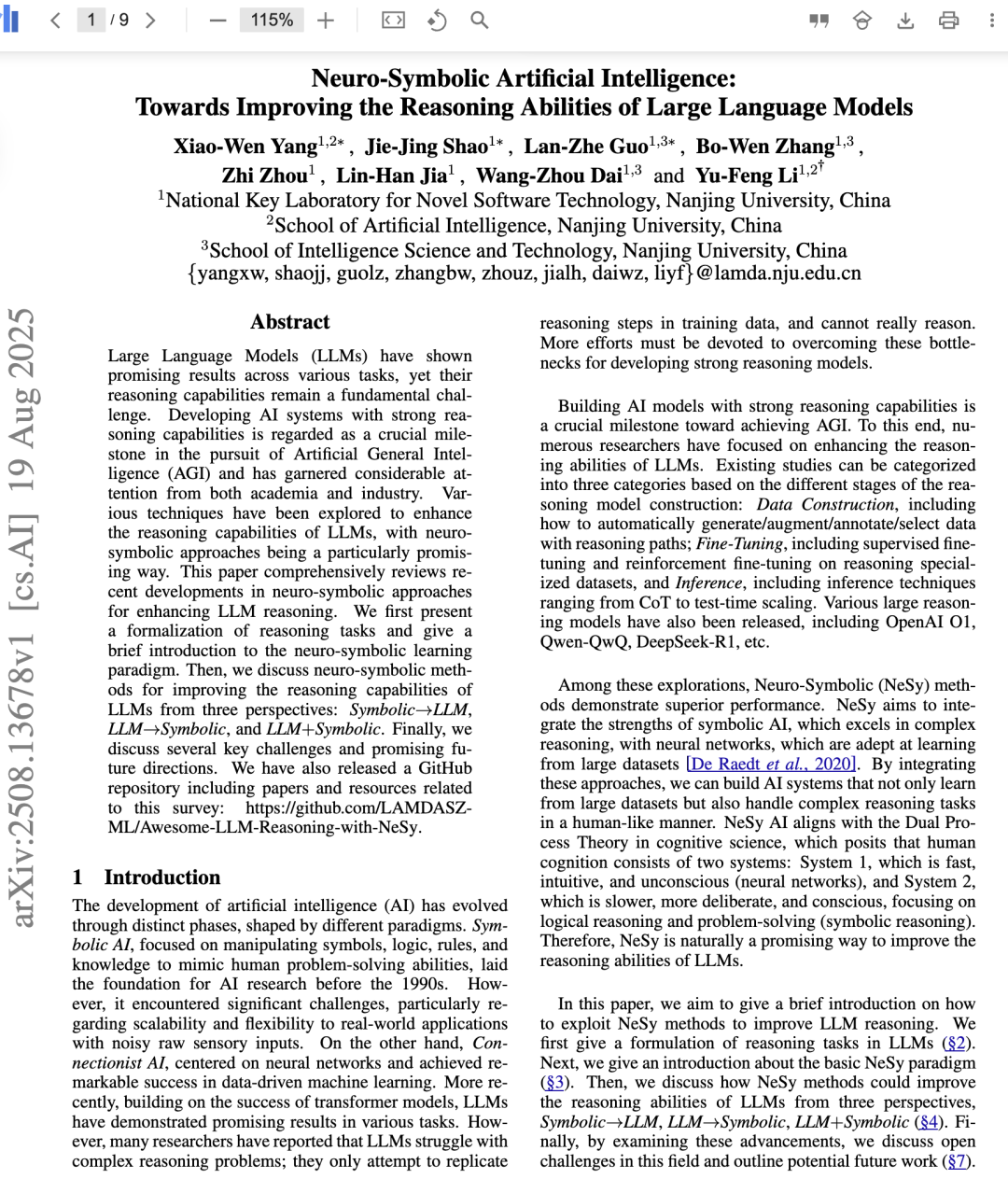 在这些探索中,神经符号(NeSy)方法展现出卓越性能。NeSy旨在融合符号主义AI(擅长复杂推理)与神经网络(擅长从大规模数据中学习)各自的优势[De Raedt et al., 2020]。通过这种融合,我们有望构建出既能从海量数据中学习,又能以类人方式处理复杂推理任务的AI系统。NeSy方法与认知科学中的双过程理论(Dual Process Theory)高度契合:该理论认为人类认知包含两个系统——系统1快速、直觉且无意识(对应神经网络),系统2则较慢、深思熟虑且有意识,专注于逻辑推理与问题求解(对应符号推理)。因此,NeSy自然成为提升LLMs推理能力的一条极具前景的路径。