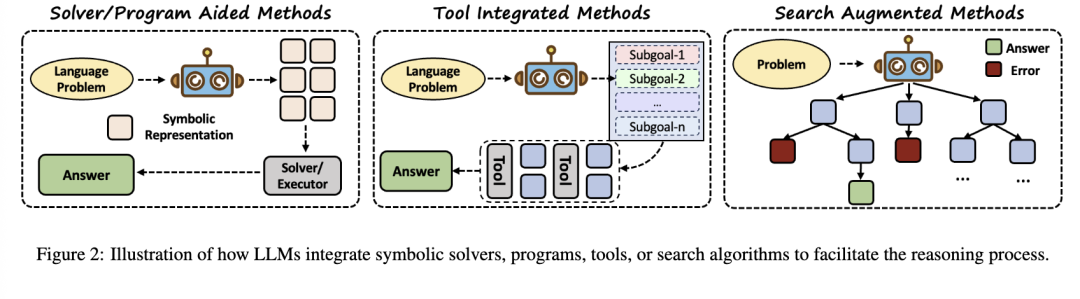 在前述两个研究分支中,大型语言模型(LLMs)与符号方法是分离运行的。例如,在 Symbolic→LLMs 范式中,符号 AI 方法负责生成或增强数据,随后 LLM 在这些数据集上进行微调;而在 LLMs→Symbolic 范式中,LLM 调用符号求解器,由后者推导出答案。